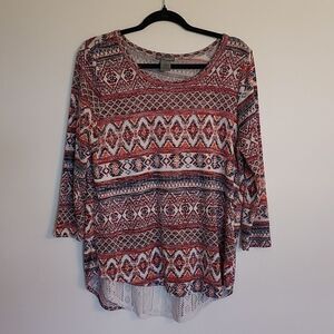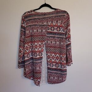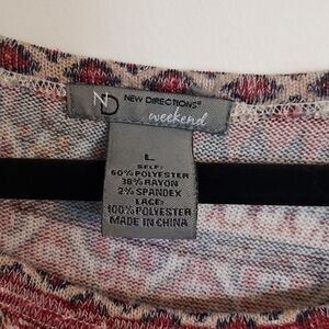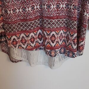 This is a lightweight sweater like knit fabric with a crochet lace inset in the back