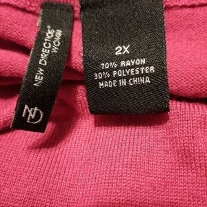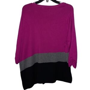 New Directions colorblock sweater in size 2X. The sweater is made of 70% rayon and 30% polyester. It features 3/4 sleeves with ruching at the bottom and an asymmetrical hem.