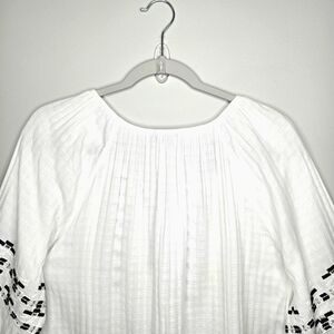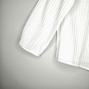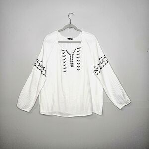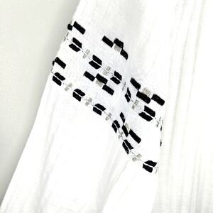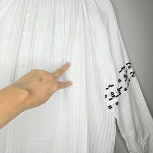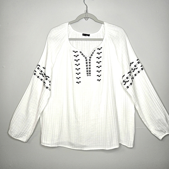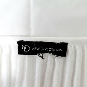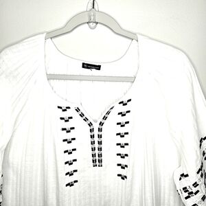 New Directions gauze or cotton, tunic top. Long sleeves. The color is white with black and silver accents. The fabric is rather sheer so a camisole might be needed for modesty. Very cool and comfortable top. Good pre-owned condition. There is one very hard-to-see yellowish spot. The last photo shows it being pointed out. You can't see it in photo and neither can you see it in person unless you know how to look for it.