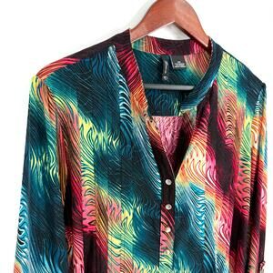 This New Directions blouse is in excellent, like-new condition! It features a vibrant tropical print, perfect for adding a touch of artsy flair to your wardrobe. The stretchy material ensures a comfortable and flattering fit, ideal for beach days or casual outings.