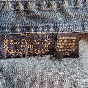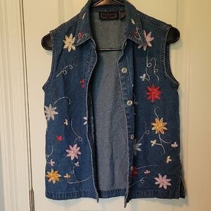 Sleeveless denim vest with floral embroidery. Features button-up front. Vibrant flower designs.