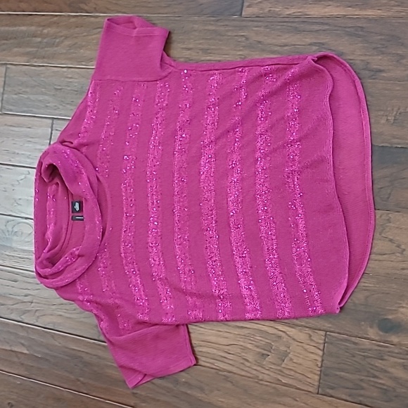 New Directions Fuchsia Sequin Striped Cowl Neck Short Sleeve Sweater size XL. Perfect for layering. Stripes & Sequins are on the front only.