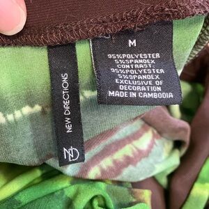 Embrace a nature-inspired look with this New Directions tunic, showcasing a vibrant green palette accented with brown. The relaxed fit and 3/4 sleeves offer both comfort and style, making it a versatile addition to your wardrobe.
