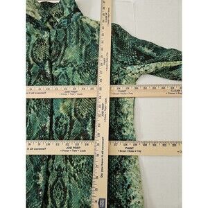 This New Directions Green Snake Print Blouse with Roll Tab Sleeves is a stylish and versatile addition to any woman's wardrobe. This size PM blouse features a collared neckline, long sleeves with roll tab accents, and a sheer design that adds a touch of elegance. Perfect for travel, casual outings, workwear, or business occasions, this blouse is made of polyester material and showcases a unique vibrant animal print snake pattern. The button-up style and petite size make it a flattering and fashionable choice for women looking to make a statement with their outfit.