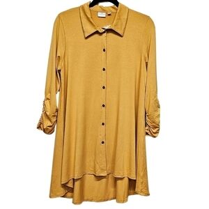 New Directions Julianna Crepe Tunic Button Down, Ruched Sleeve, Squash Yellow.