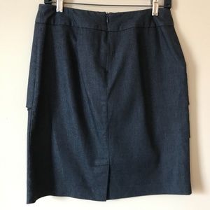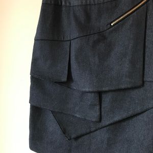 Unique pencil skirt with lots of personality and stretch! Dark denim coloring. Layered edgy design on the front, zip up back with small slit at bottom, front zipper is just for aesthetic (not an actual pocket).