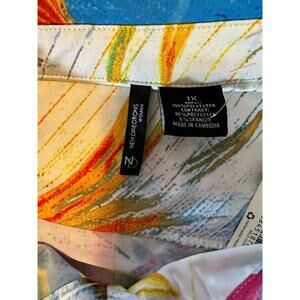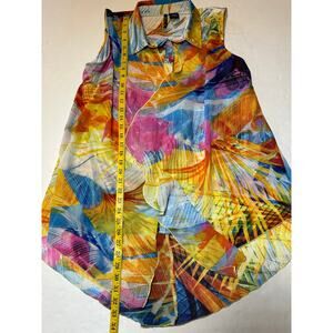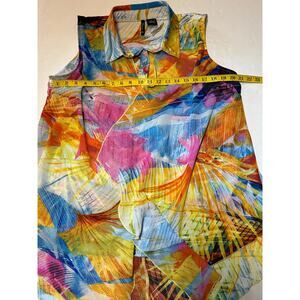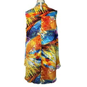Vibrant sleeveless blouse with abstract print. Features a mix of blue, yellow, pink, and orange hues. Lightweight and flowy design.