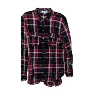 New Directions Plaid Long Sleeve Button Down Shirt Women’s Large Navy Red Gray
