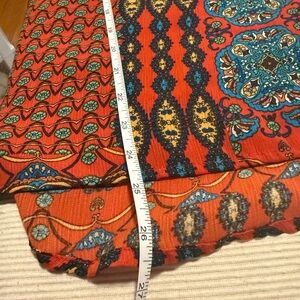 This vibrant blouse from New Directions showcases a bold red and orange graphic design, featuring a relaxed boxy fit and a stylish mandarin collar. The three-quarter sleeves and lightweight fabric make it perfect for warm weather, while the intricate patterns add a touch of elegance to any outfit.