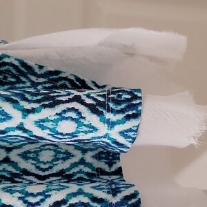 New Directions Size M Blue Aqua and Teal Patterned Sleeveless Top w/ White Under Layer. Gently Used Condition, No Holes, Rips, Stains or Snags. Cute Patterned Over Layer with Raw Hem White Under Layer. Please refer to measurements in photos to ensure proper fit. Shown on size 4-6 Mannequin.