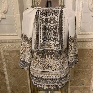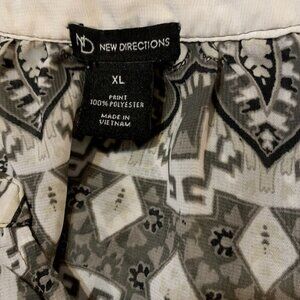 New Directions. Size XL. Border Print Poly Chiffon Pullover. Raglan Sleeve w Elastic. Center back 27". Sleeve 21" to neck. Shoulder to hem 28.5". V-neck. Bust 21.5/43". (Armpit to armpit X2 - Taken with tailor's tape so could have a bit of play. Please add your preferred amount of ease.) Very good pre-loved condition. No damage that I can see. Vietnam.