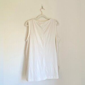 This sleeveless tank top features a blend of polyester and spandex for comfort and flexibility. Its cream color and comfy design offers a stylish yet casual look.