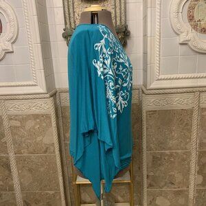 New Directions. Size Large. USA. Blouson. Embellished. Modified Batwing Top - actually have a bust measurement - 46". Center back 22". Faux embroidery. Elastic at hem. Rayon/spandex. Stretch. Beaded. Excellent pre-loved condition. No spots, tears or damage.