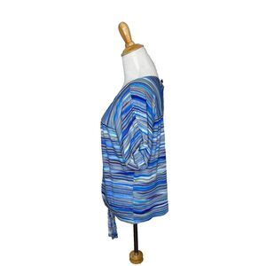 New Directions Tie Front Blue Grey Mixed Stripes Top Blouse Size Medium. In good condition. Pull over. Tie 56 % rayon / 44 % polyester.