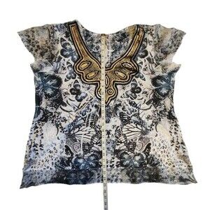 Brand: New Directions Weekend. Occasion: Casual. Any. Size Type: Regular. Size (Women's): 1X. Material: 100% polyester (Exclusive of Decoration). Neckline: V-neck. Style: Wintop. Sleeve Length: Short sleeve. Color: Black. White. Gold. Pattern: Butterfly. Floral. Sublimation. Features: Sequin embellishment at the neckline. Flutter sleeve.