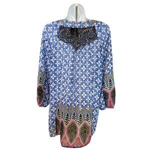 New Directions Womens Sheer Tunic Top XL Floral Blue Pink Lace-Up Boho Lagenlook