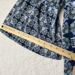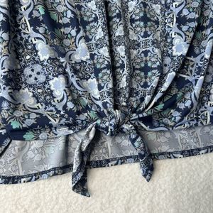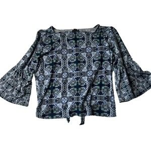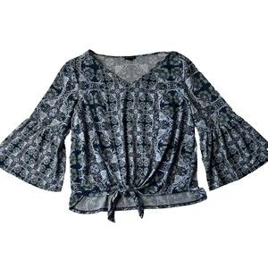 New Directions XL Women’s Blouse Bell Sleeve Knot Front Blue Floral Geometric