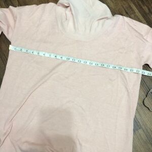 New Directions knit sweater with tags has bottom that is in a slant. Has a split in side. It’s a lite pink color