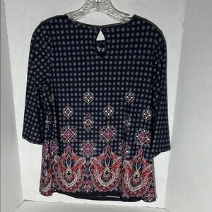 This relaxed graphic blouse from New Directions features a vibrant ombre design transitioning from blue to pink. The 3/4 sleeves and intricate border print add a touch of elegance, while the soft knit fabric ensures comfort. Perfect for casual outings, this top combines style and ease effortlessly.