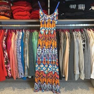 New Directions orange/blue print adjustable strap padded bust maxi dress size S