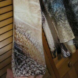 New Directions brand - Beautiful fall colors top with long sleeves. The front has a knit overlay with random small sparkles. Colors are golden browns, black, gold, tan, blue and cream in a swirled and animal print pattern. Prettier in person. Top is stretchy and like new condition.