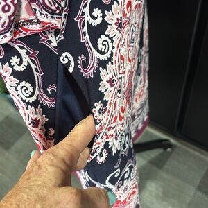 New Directions,Scoopneck,3 quarter sleeve,hip pockets,loose,stretch Navy pattern