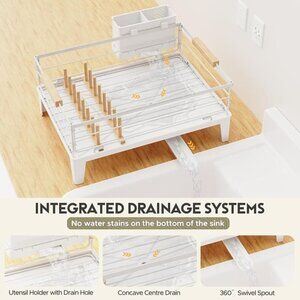 Efficient automatic drainage - The dish drying rack comes with a retractable 360° rotatable drainer that can be rotated to fit your counter. The water in the utensil holder flows directly to the drain rack through the drainage outlet. The drainboard adopts the upgraded design, and the central drainage hole has an X-shaped slot and professional slope. This ensures that water flows back to the sink quickly and easily, eliminating countertop mess.