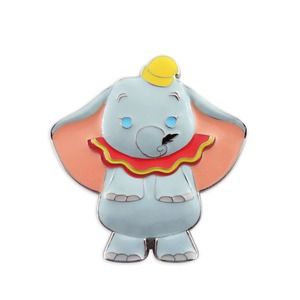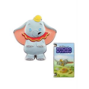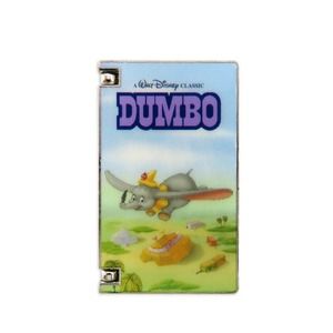 Includes one Dumbo elephant pin and one hinged pin reproducing the classic Dumbo VHS ''clamshell'' packaging art that opens to reveal an image of what looks like a ''VHS cassette'' inside. There is a die cast feather icon on inside cover of the VHS pin.