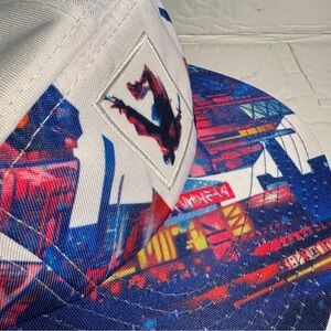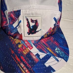 Vibrant Spider-Man cap with dynamic cityscape design.