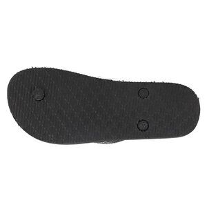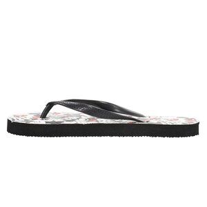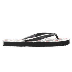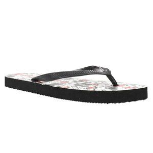 Brand new with tags, officially licensed women's size pair of flip flops or sandals with black foam rubber soles and flexible rubbery black thong straps for your feet, and featuring an allover print of Mickey Mouse in various expressions along with his name printed all in white, black and red.