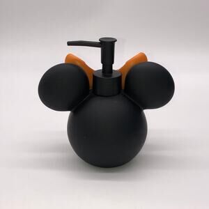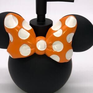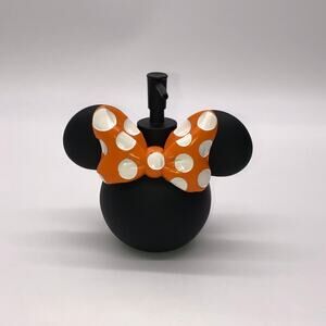 New Minnie Mouse head black lotion / soap dispenser pump with and orange and white polka dot bow. Perfect for Halloween. Measures approx 6”h x 2.5” in diameter.