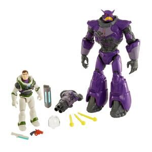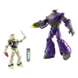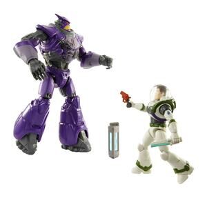 Discover Disney and Pixar's Lightyear. Stranded on an uncharted planet, Buzz Lightyear and his crewmates will need to battle hostile plants, giant bugs and the ultimate threat, Zurg, to complete their mission and return home. Let the ultimate conflict begin, with these posable action figures of Space Ranger Alpha Buzz and his primary foe, Zurg, both with battle damaged suits and armed for battle. Zurg towers menacingly at about twice the size of Buzz and has a swappable cannon arm with 3 projectiles. Buzz is ready to face off with him, armed with a Laser Blade DX and Crystallic Fuel Cell. If he needs backup from his team, he also has a Flare Emergency Rescue Pistol (FERP) at the ready. Relive the excitement of space exploration, conflict and teamwork of Disney and Pixar's Lightyear, with these Buzz Lightyear and Zurg action figures, complete with battle-ready accessories • At 9.97 inches tall, Zurg is a scale-accurate foe to Buzz Lightyear. Enjoy battle play with 13 posable joints and a swappable blaster arm with 3 projectiles! His iconic purple armor has visible battle damage for enhanced storytelling • At 5 inches tall, Buzz Lightyear in his movie-accurate Space Ranger Alpha suit also has battle-worn scorch marks and features 12 movable joints, ready for action moves and posing! • Buzz comes armed and ready, too, with a Laser Blade DX, a Crystallic Fuel Cell and his FERP a Flare Emergency Rescue Pistol • Makes a great gift