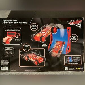 Brand new factory sealed! Toys R Us Exclusive Disney Pixar Cars 3 Lightning McQueen 2-Sided Stunt Racer With Ramp. - 2.4 GHZ multi-chamnel radio control - 300+ mph top scale speed - 2-sided car flips and keeps going - includes USB rechargeable battery