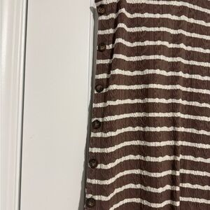 This is a stylish Doe & Rae sheath dress in a size medium, featuring a brown striped pattern and a sleeveless design with a V-neckline. The dress is embellished with button closures down the front, adding a trendy touch to the overall look. Made from a comfortable polyester blend knit fabric, this mini dress is perfect for various occasions such as travel, casual outings, or workwear during the summer, fall, and spring seasons.