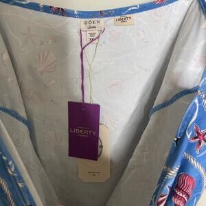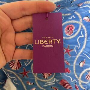 New Doen Marbella maillotone piece swimsuit blue shell liberty Solent shores XXL. New with tags. The MARBELLA MAILLOT in Liberty Solent Shores by Doen is a stunning example of timeless swimwear design. Combining a flattering fit with a vibrant print, this one-piece swimsuit exudes effortless style and elegance. Perfect for beachside lounging or a dip in the ocean, its high-quality fabric ensures comfort and durability. The sophisticated silhouette and playful pattern make it a versatile addition to any swimwear collection.
