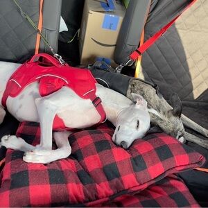 Fasten the adjustable loop around the rear seat head rear. Fasten the hook on the adjustable strap to the dogs harness.