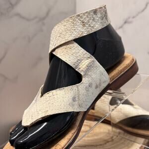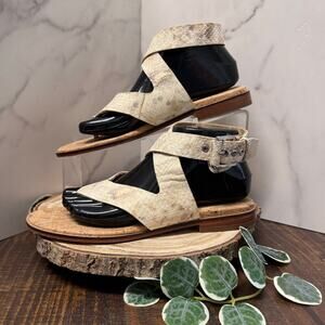 These stylish Donald Pliner Lola 2 snakeskin print sandals are thong style with a crossband strap that wraps around the foot and an ankle providing a secure fit. They feature a soft leather upper in a snakeskin print and silver tone hardware.