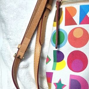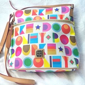 Vibrant Dooney&Bourke leather crossbody with bold graphic design. Features a mix of colors for a lively look. Perfect for everyday style.
