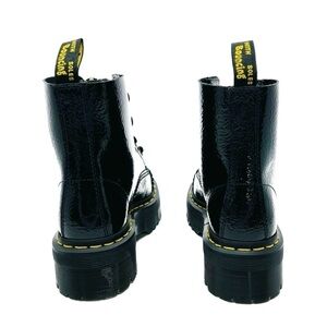Style Description: Platform ankle boots crafted with a distressed, crinkle embossed high-shine patent leather | Stacked high with the chunky tread Bex quad sole | Fitted with a removable "jungle zip" feature that is removable so, if you'd like, you can wear these as traditional lace-ups (like the Jadon style) | Eight tightly spaced eyelets | 2” heel offset by 1.5” platform | Construction - Made with a Goodyear-welt construction with signature yellow stitching | Slimmer footbed and a more tapered toe shape