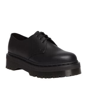 The new Vegan 1461 Quad Mono is a towering version of our classic 3-eye shoe, stacked on an all-black Quad Retro sole for a heel-to-toe monochrome statement.