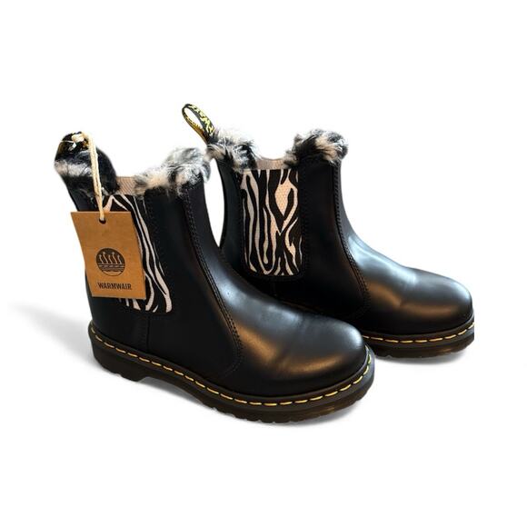 The product is a new pair of Dr. Martens Women's 2976 Leonore Chelsea Boot in Black Atlas size 6. These ankle boots feature a round toe, pull on closure, and a 1.5 inch block heel. Made with faux fur lining and leather upper material, these boots have a stylish animal print pattern with accents of fur trim. Perfect for casual occasions, these Chelsea boots combine elements of zebra, art, biker, punk, grunge, bohemian, gothic, tribal, retro, hipster, anime, y2k, celebrity, and 90s styles, making them a versatile addition to any woman's shoe collection.