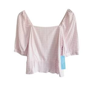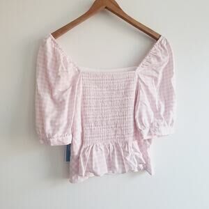 New with tags Draper James gingham pink and white linen top. Elastic smocked back. Square neck ruffled bottom. Size medium.