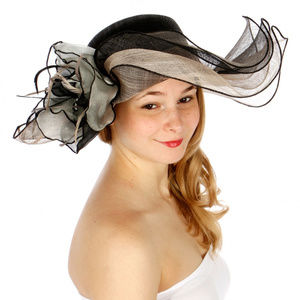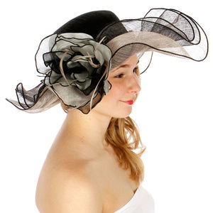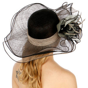 dress hat features a wide, wavy brim and a large flower with feathers. One size fits most Weight 3.7 oz. Size 7" Brim width 5" Crown Material 100% Sinamay