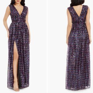 Soft pleats lend graceful movement to this exquisitely sparkling sequin-covered gown designed with a deeply dipped neckline and a stem-showing side vent.