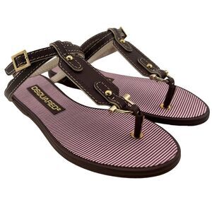 New Dsquared 2 Women 6 / 36 Sandals Brown Leather Flat Ankle Gold T-Strap Shoes