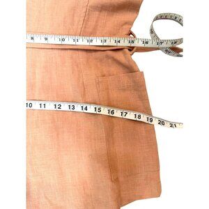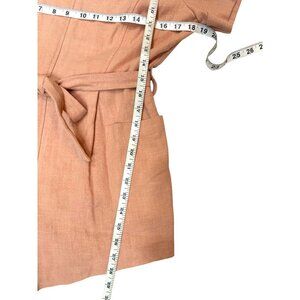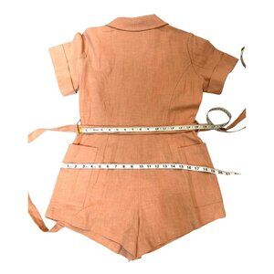 This polished romper from Du Paradis offers a tailored design with a collared neckline, functional front zipper, and a flattering tie belt. Its short sleeves and coral pink hue make it a versatile piece, while the front pockets provide added utility. Perfect for an elegant yet casual look. Size medium. Measurements in photos.