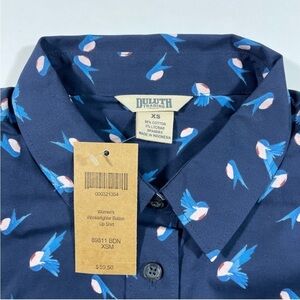 New Duluth Wrinklefighter Button Front Shirt Blue Bird Print Size XS