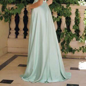 Crafted from luxurious Satin, this elegant long A-line bridesmaid dress features a sophisticated cowl neckline and a beautifully draped bodice, supported by delicate sleeveless straps. The smooth fabric cascades gracefully to the floor in an A-line shape, providing comfort and timeless elegance. A striking open back adds an alluring detail, completing this stunning piece perfect for any wedding party or formal event.