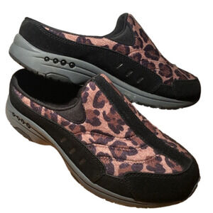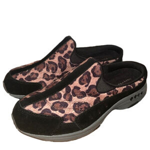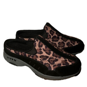 NEW - EASY SPIRIT - Brown Leopard Print with Black Suede Trim Open Back Mules Style SE TRAVEL TIME 381 - Size 8W. NWOT!
