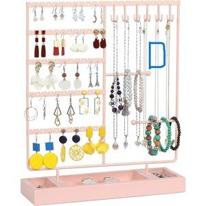 【POWERFUL STORAGE FUNCTION】There are earring holes on the jewelry rack,so this earring stand .You can hang up your favorite studs, dangle earrings, and hoops with ease. Enough to hold all your earrings at a glance, no more digging around in a drawer or jewelry box